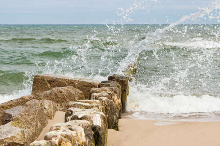 groynes on the beach of the Baltic Sea in Zingst. Waves break on the wood. they protect the coast of the German Baltic Sea from the waves. In addition, they are also beautiful to look at.