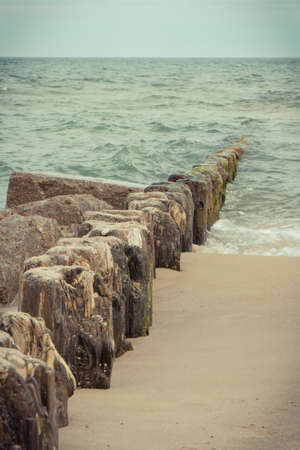 Vintage long wooden breakwaters and sea waves at beach. Stormy and windy day at sea. Travel and tourism.