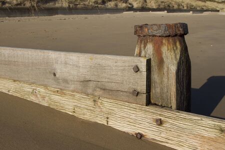 Wooden planks, water smoothed, attached to a post with metal bolts form a sand barrier on a beach.
