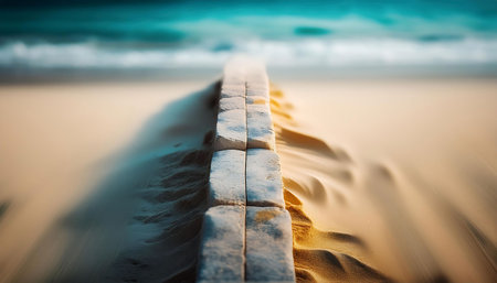AI Generated. Blurry seascape featuring a remote coastline and a pathway bordered by walls