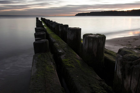 Wooden breakwater on the beach in the evening, Baltic Sea, Poland