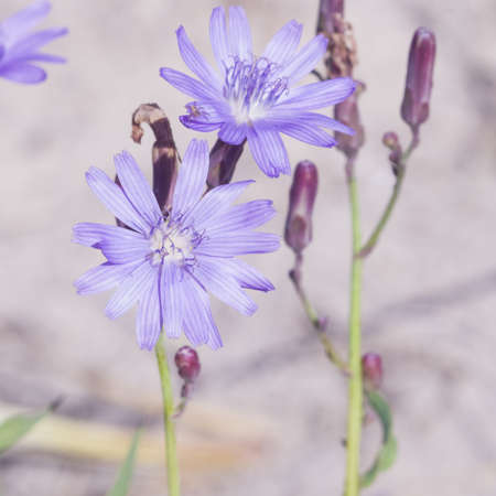 delicate blue flowers of chicory, plants with the Latin name Cichorium intybus on a blurred natural background, narrow focus area