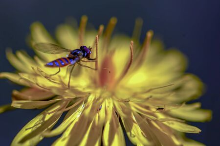 Macro photography of an orange and blue striped hoverfly resting on a dandelion flower. Captured at the Andean mountains of central Colombia.