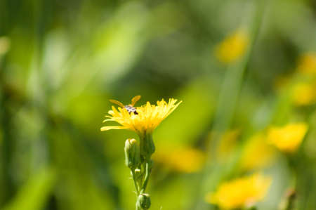 Close-up of perennial sowthistle flower pollinated by a bee side view with green blurred plants on background