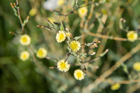 Lactuca species Wild lettuce Wild plant of the lettuce family with small pale yellow flowers on greenish background flahs lighting