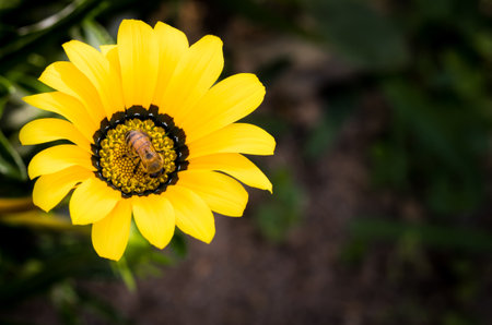Shallow depth of field (selective focus) details with a bee on a dandelion flower (Taraxacum) during a sunny spring day.