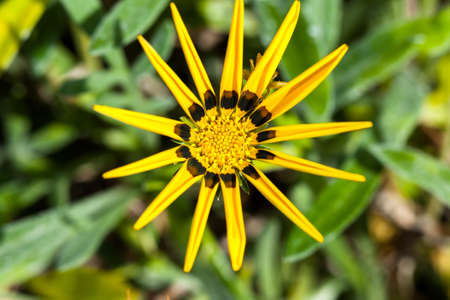 yellow gazania daisies surrounded by leaves and branches shot at shallow depth of field