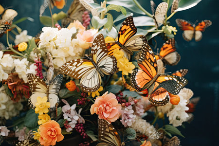 Close-up of vibrant butterflies perched on a colorful bouquet of flowers, showcasing nature's beauty and diversity