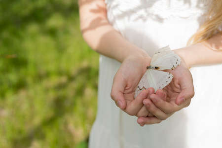 The hands of a teenage girl wearing a white dress are carefully holding a big white butterfly. Copy space. Conceptual and commercial design.