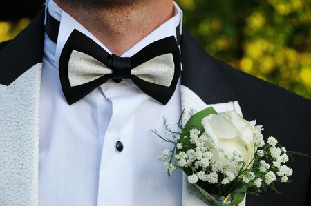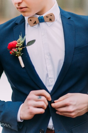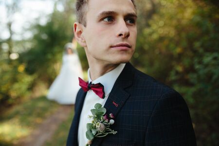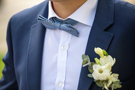 Handsome groomm dressed a tie bow. Wedding day. Man outside