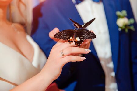 Exotic butterfly. Beautiful live butterflies sit on the hands of the bride and groom. Received as a gift at the wedding Banquet.