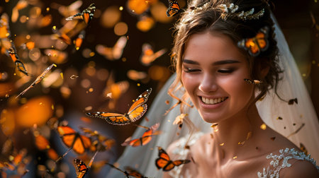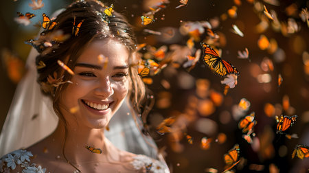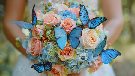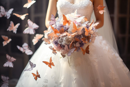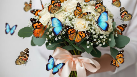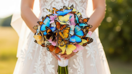 a bride in a white dress holds a wedding bouquet with live butterflies in her hands. Generative AI