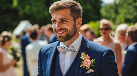 A smiling man in a stylish suit stands at a wedding celebration, exuding confidence and joy. The vibrant outdoors creates a cheerful atmosphere filled with love and happiness.