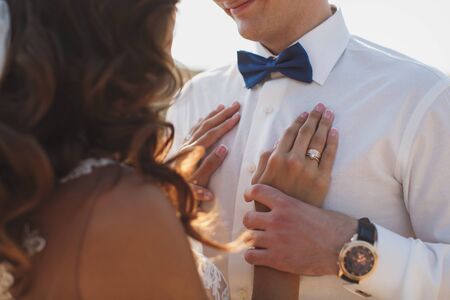Close-up businessman groom holding bow-tie in his hands. Concept of men stylish elegance clothes