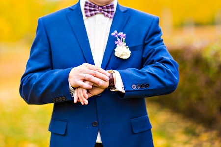 Blue bow tie in the hands of the groom. Bow tie in the hands of a man