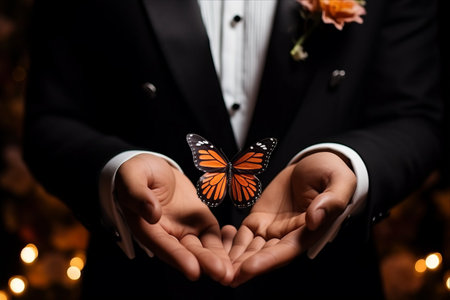 Beautiful tropical butterfly sitting on the groom's suit.