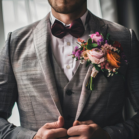 A well-dressed groom in a blue suit proudly displays a peach bow tie and a delicate floral boutonniere. The setting exudes a classic and refined atmosphere.