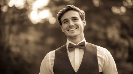 A young man dressed in a vest and bow tie beams with happiness, surrounded by soft bokeh lighting in a tranquil outdoor area during early evening.