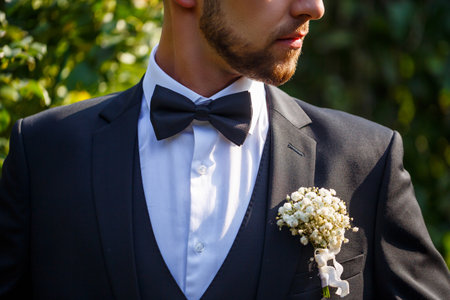 Groom, flowers on suit lapel, awaits joyous wedding day, symbolizing love and happiness in a blissful and eagerly anticipated sacred union.