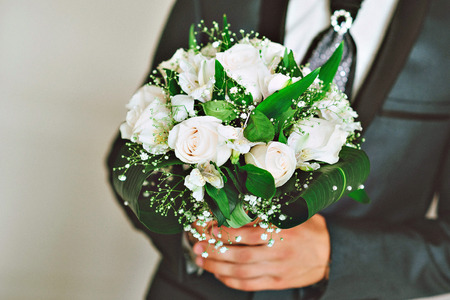 Stylish groom are holding bridal bouquet. Wedding bouquet in man hands.