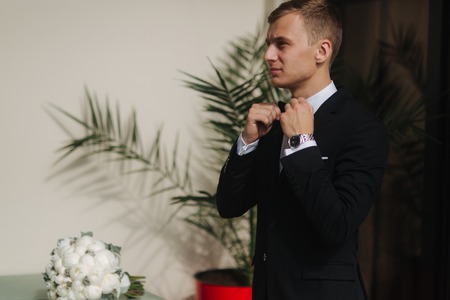 Close-up businessman groom holding bow-tie in his hands. Concept of men stylish elegance clothes