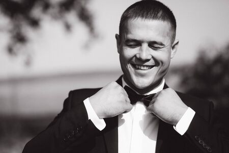Handsome groomm dressed a tie bow. Wedding day. Man outside. Young man smile