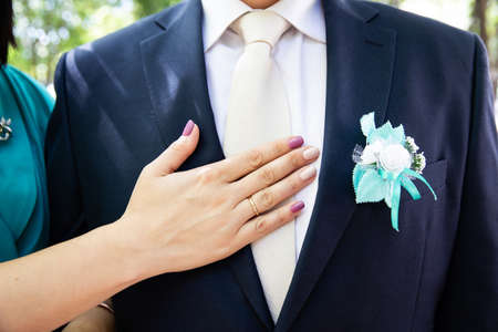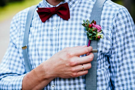 stylish boutonniere on the grooms jacket, wedding day, beautiful flower boutonniere, wedding concept