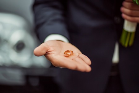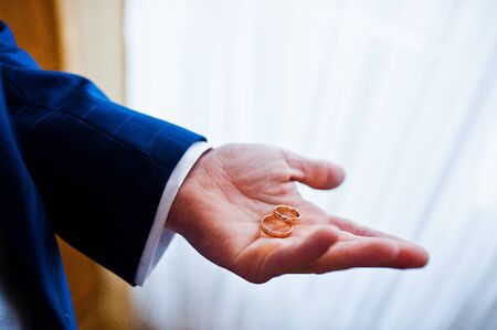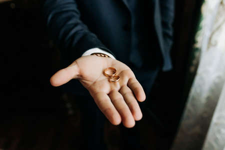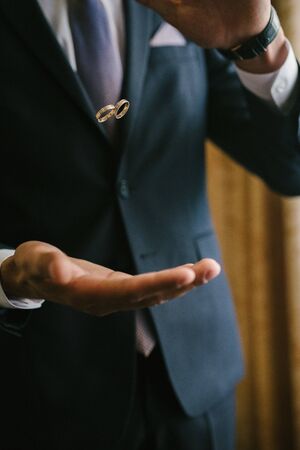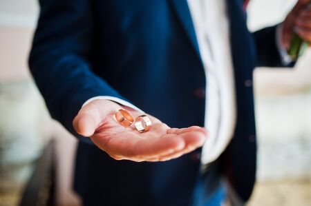 Groom holding wedding rings on the palm, wedding ring in groom hand