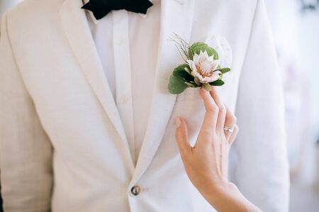 white roses flowers in buttonhole, the groom is dressed in a dark suit and a white shirt. Wedding ceremony, elegant suit. Outfit of the day