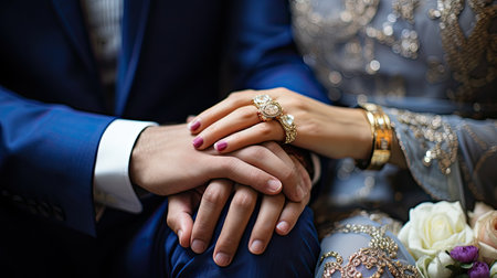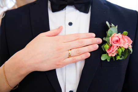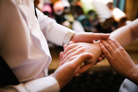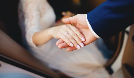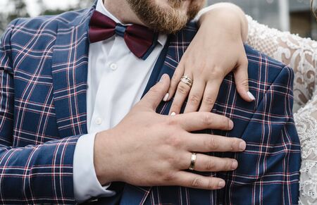 The hands of the bride and groom hug each other. Tenderness and hugs of a man and a woman at a wedding.