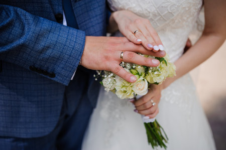 Romantic Wedding Hands with Bouquet and Wedding Rings.