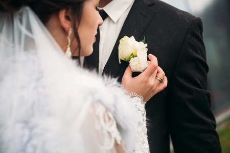 Marriage couple embracing. Bride in white wedding dress holding hand on grooms chest. Wedding day concept.