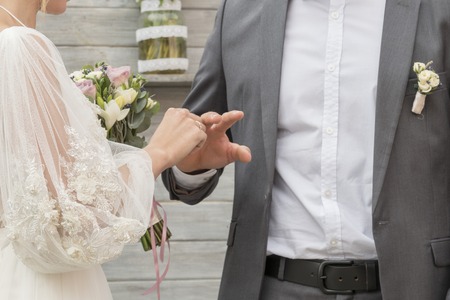 Bride wears groom a wedding ring Bride hand holds a beautiful wedding bouquet.
