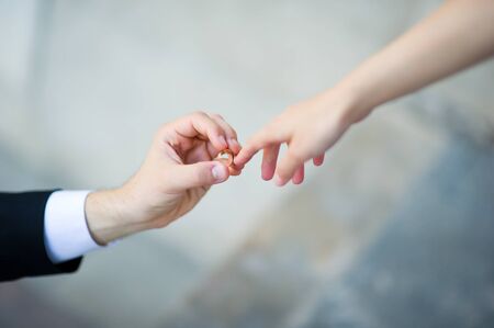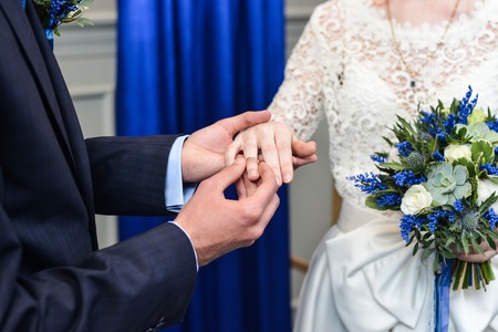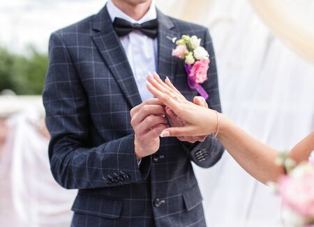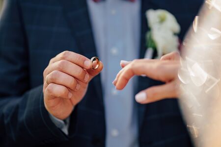 the bride and groom put on each other rings. close-up. wedding traditions.