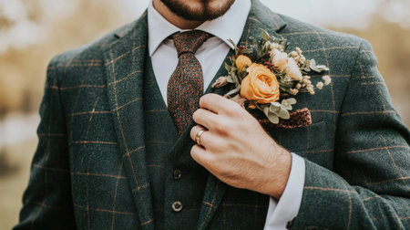 A well-dressed groom showcases a floral boutonniere in a serene outdoor setting. The elegant details highlight style and romance on his special day.