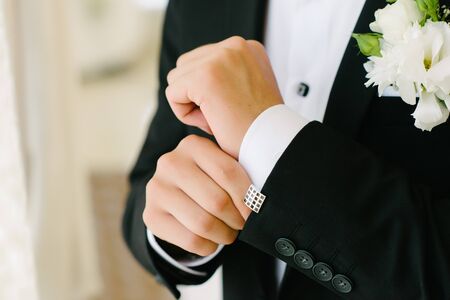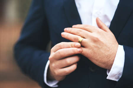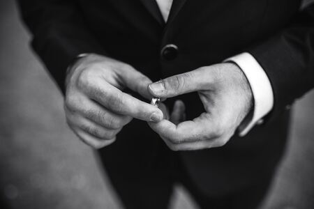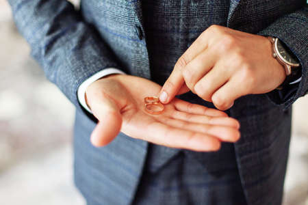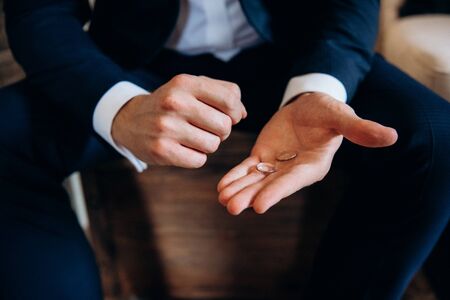 Morning of the groom preparation. Young and handsome groom hold wedding rings on hand.