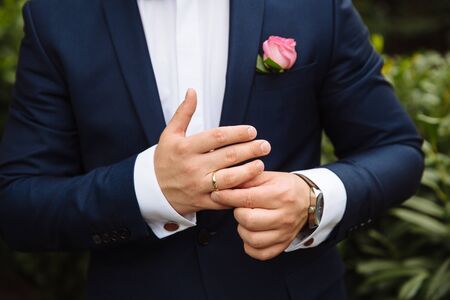 Close up of a groom wearing a blue suit with a white shirt and tie. Bridegroom adjusting his cufflinks and wearing a wedding band while standing outdoors on a sunny day