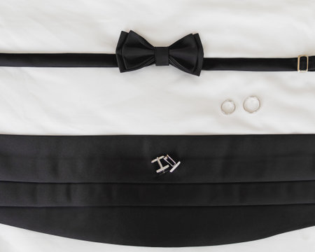 Pair of wedding rings, cufflinks, black bowtie and sash. Traditional accessories of the groom at the wedding.