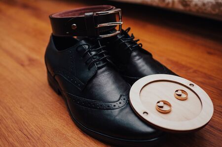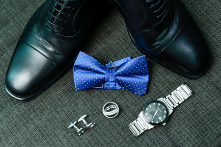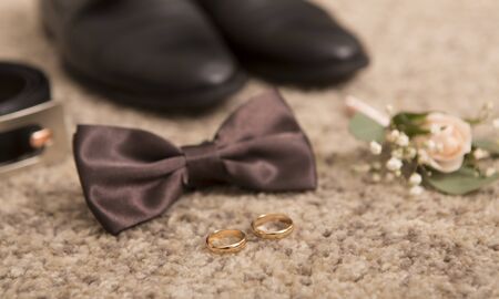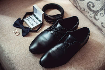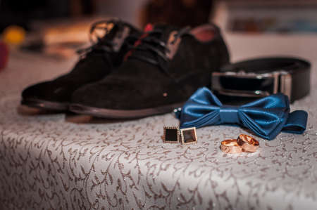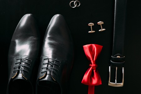 Close up of modern man accessories. wedding rings, black bowtie, leather shoes, belt and cufflinks