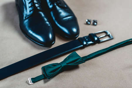 Close up of modern man accessories. beige bow tie, black leather shoes, belt and watch