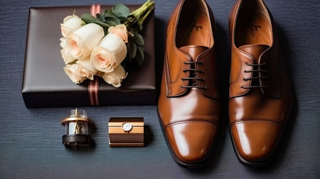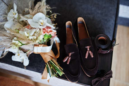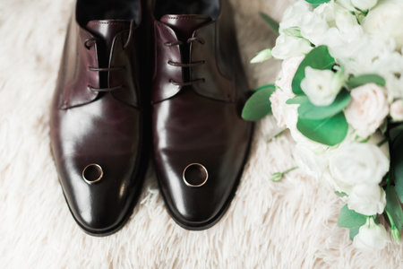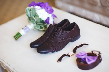 Groom's morning. Wedding accessories. Shoes and wedding bouquet, rings, boutonniere and a belt