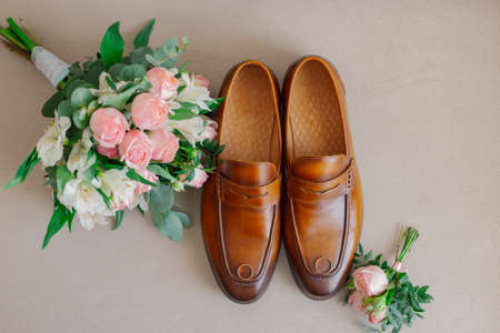 Set of mans fashion shoes with two golden wedding rings and beautiful wedding bouquet with different flowers, roses