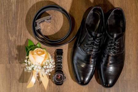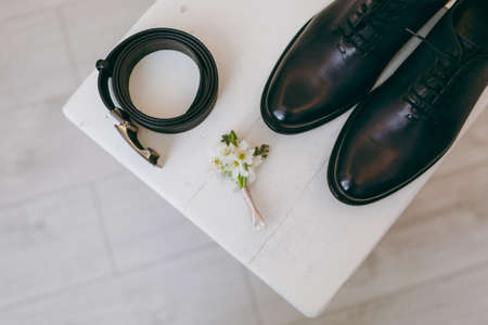 Close up Beautiful elegant wedding polished black shoes with shoelaces, belt and flower boutonniere for the groom on a chair on background a light wooden floor. Wedding wear, accessories.