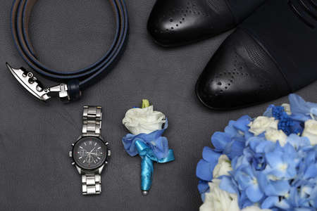 Wedding shoes, belts, watches and bouquet on a white surface. Accessories for the groom on the wedding day.