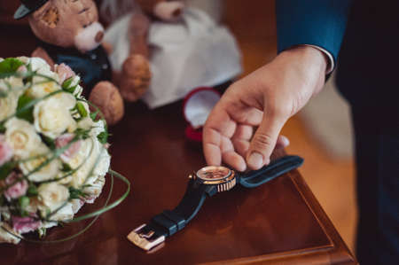 Accessories for the groom on the wedding day. Watches, rings, belt, shoes. The wooden surface.