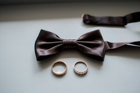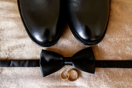 Groom's accessories in the form of black shoes, bow ties and wedding rings. Preparing the groom for the wedding ceremony. Men's classic wedding day accessories
