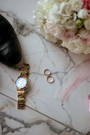 wedding accessories. Bride and grooms shoes, wedding ring watches, bridal bouquet. Top view.