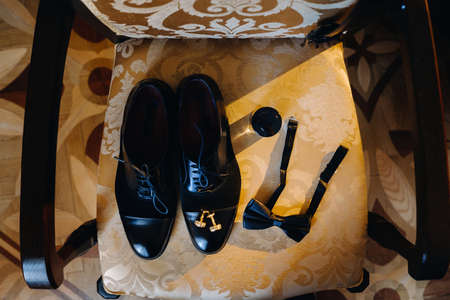 The groom is gathering in the morning. Men's classic patent leather shoes. A bow tie. Wedding details. Watch with leather strap.