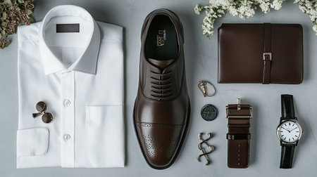 A refined flat lay of men's essentials: dark brown brogues, a white shirt, cufflinks, leather belt, wallet, and watch, designed for the modern gentleman.