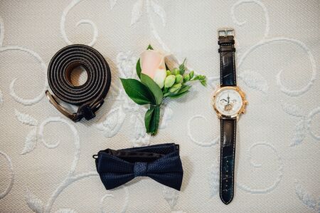 Mens accessories, leather belt, perfume, bow tie, grooms golden rings, watches and brides on a white table. Businessman clothing detail concept.